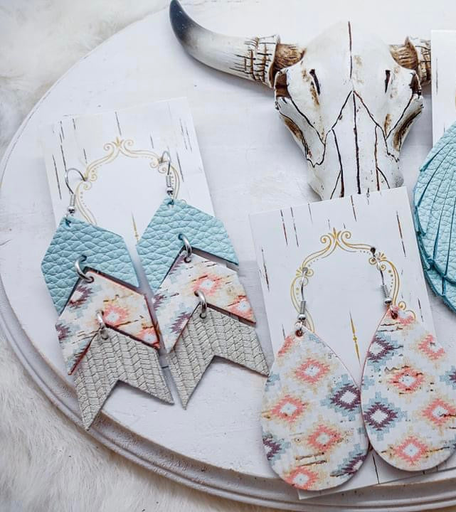 Dusty mint, cream embossed, and mojave aztec print. Genuine leater.